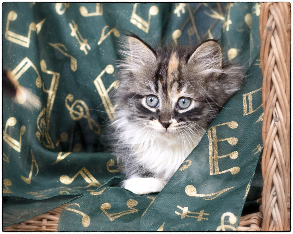 … is the Energizer Kitty. He’ll run after toys, climb, jump on his siblings, roll and tumble. He’s good at problem-solving and loves adventure, even if he has to make his own. He’s sweet, bold, strong, and clever. He’s learning to play gently. Quinn has an easy-care coat, and he’s going to be a big adult. He’ll thrive in a family with lots and lots of time for active play.