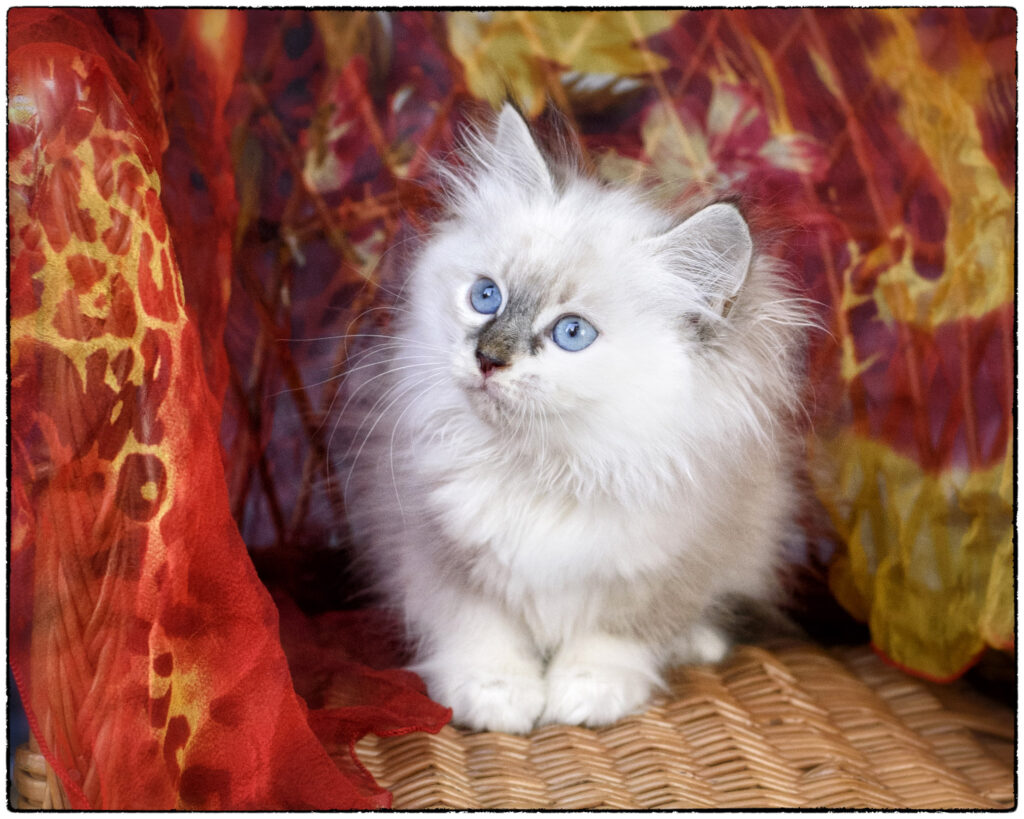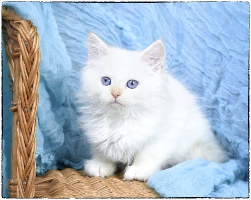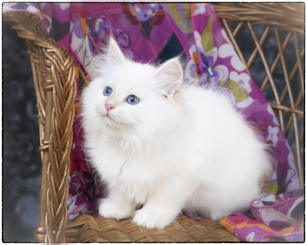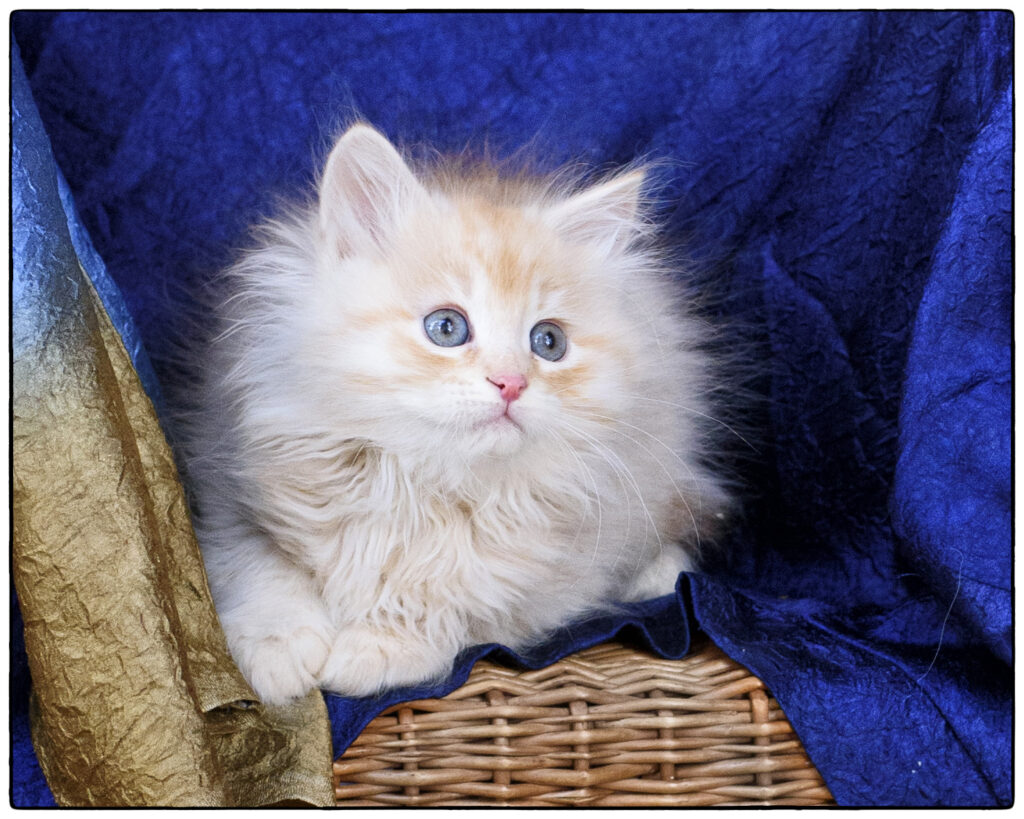 … has pretty eyes, incredibly soft fur, and a toasted marshmallow nose – but she’s no quiet miss. She’ll grab a toy, growl “ha-ha! It’s mine!” and scamper away with her brothers in hot pursuit. Feathers are a favorite toy for her to play, kick, and growl about. Her coat will need regular brushing. Qatya loves feeding time, and comes running when you call.
