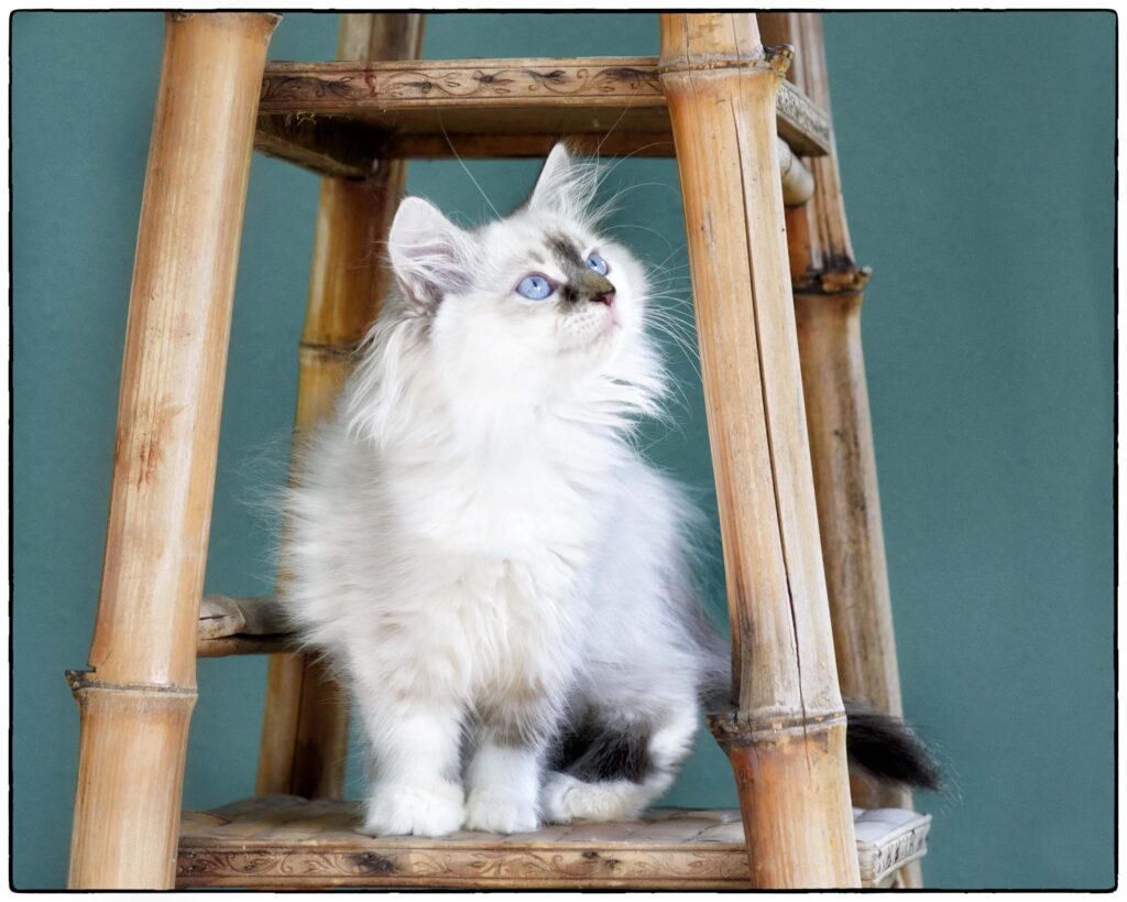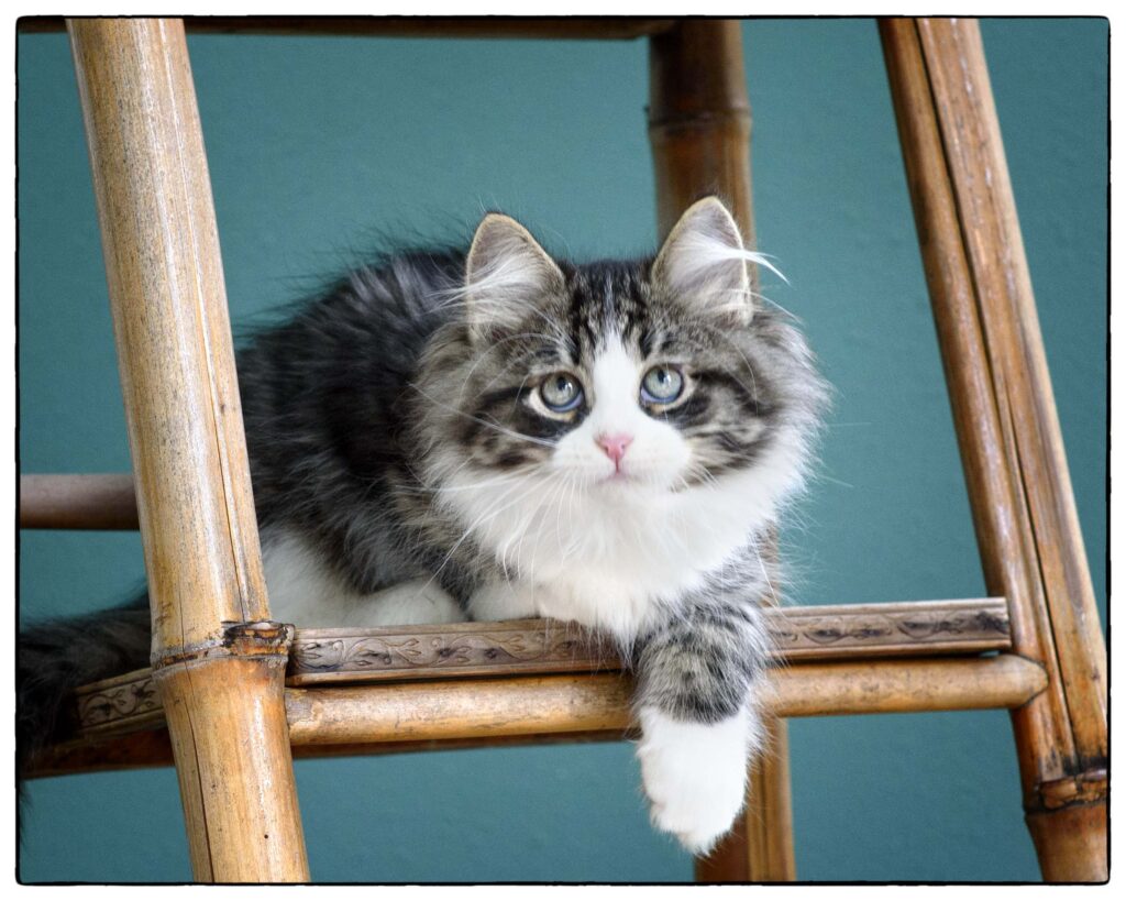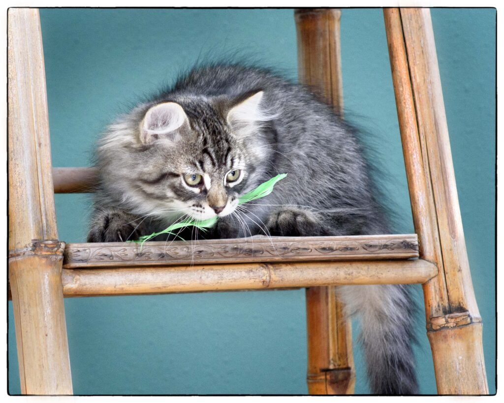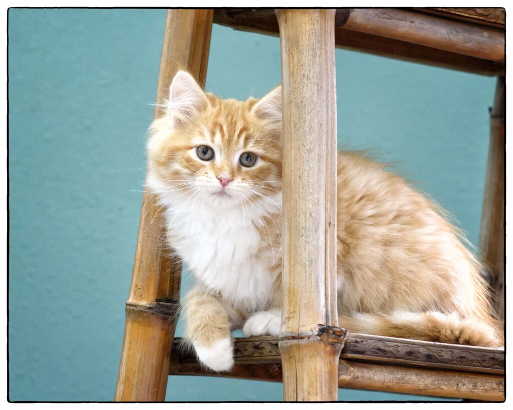 … loves to run, play, and climb. She tends to choose her roll-and-tumble opponents based on size, going for the biggest she can find. At the same time, she’s gentle and sweet, happy to lie near you for nap time. Qatarina’s beautiful coat will stay cloud-soft with regular brushing. She’s good with soft paws, and will love a family with lots of active play.